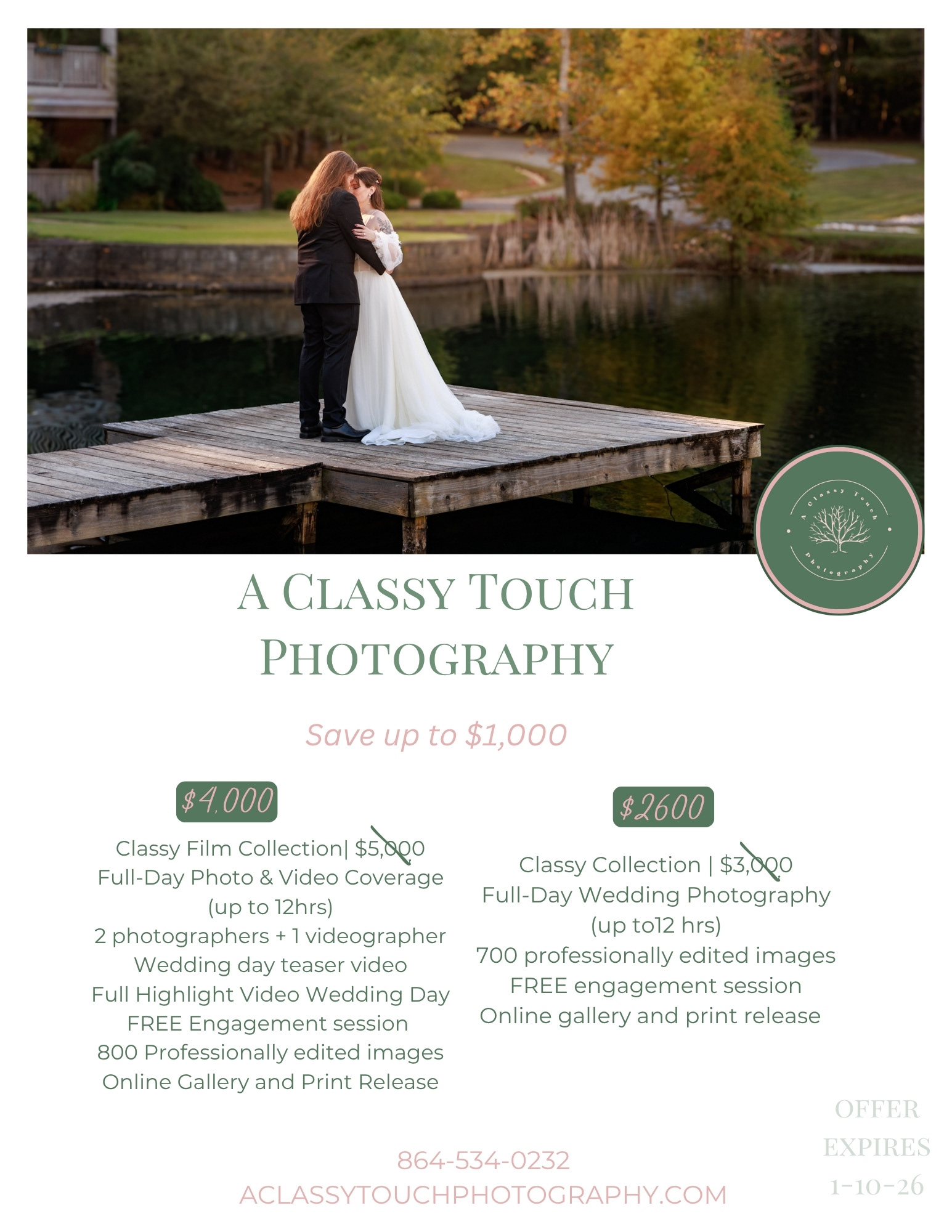 This season, enjoy exclusive wedding savings with A Classy Touch Photography.